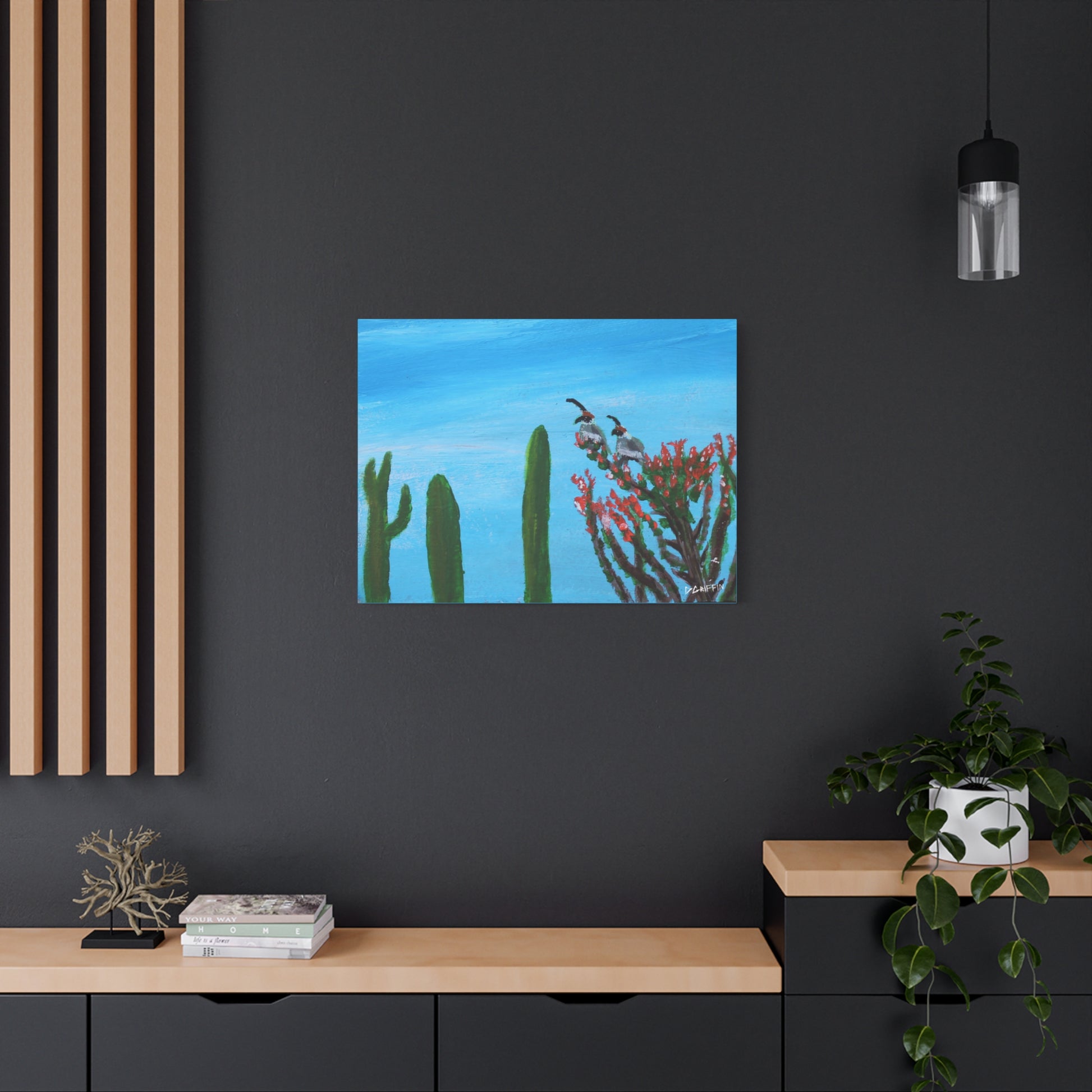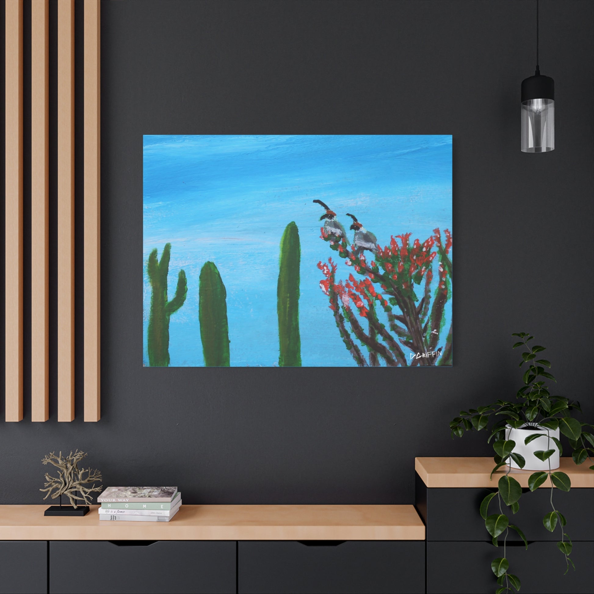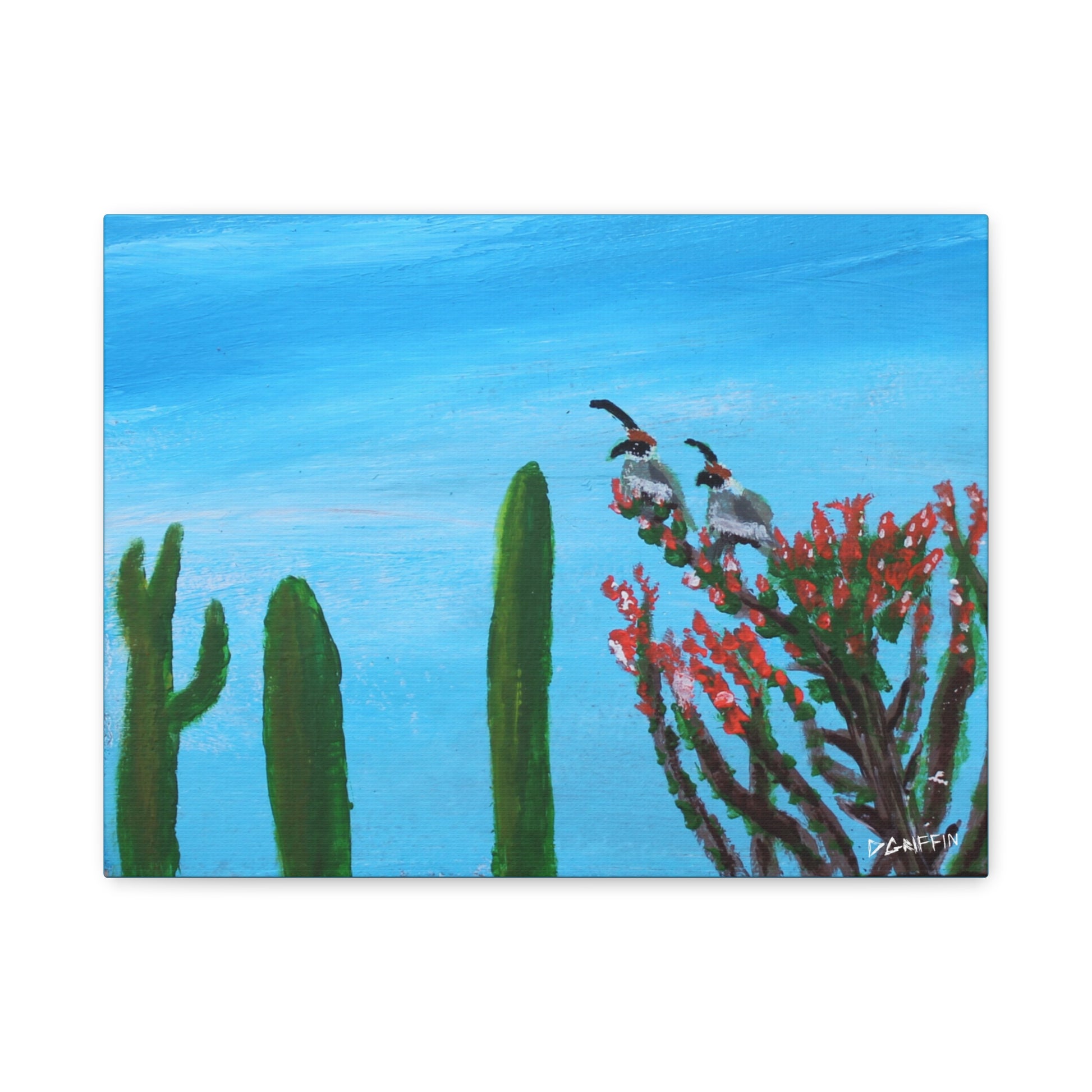 "One of my earlier works, this piece captures a desert scene featuring two quails perched on a blooming ocotillo against a vibrant blue sky, with the silhouettes of saguaros in the background. The work was originally painted on stone" - Daniel Griffin