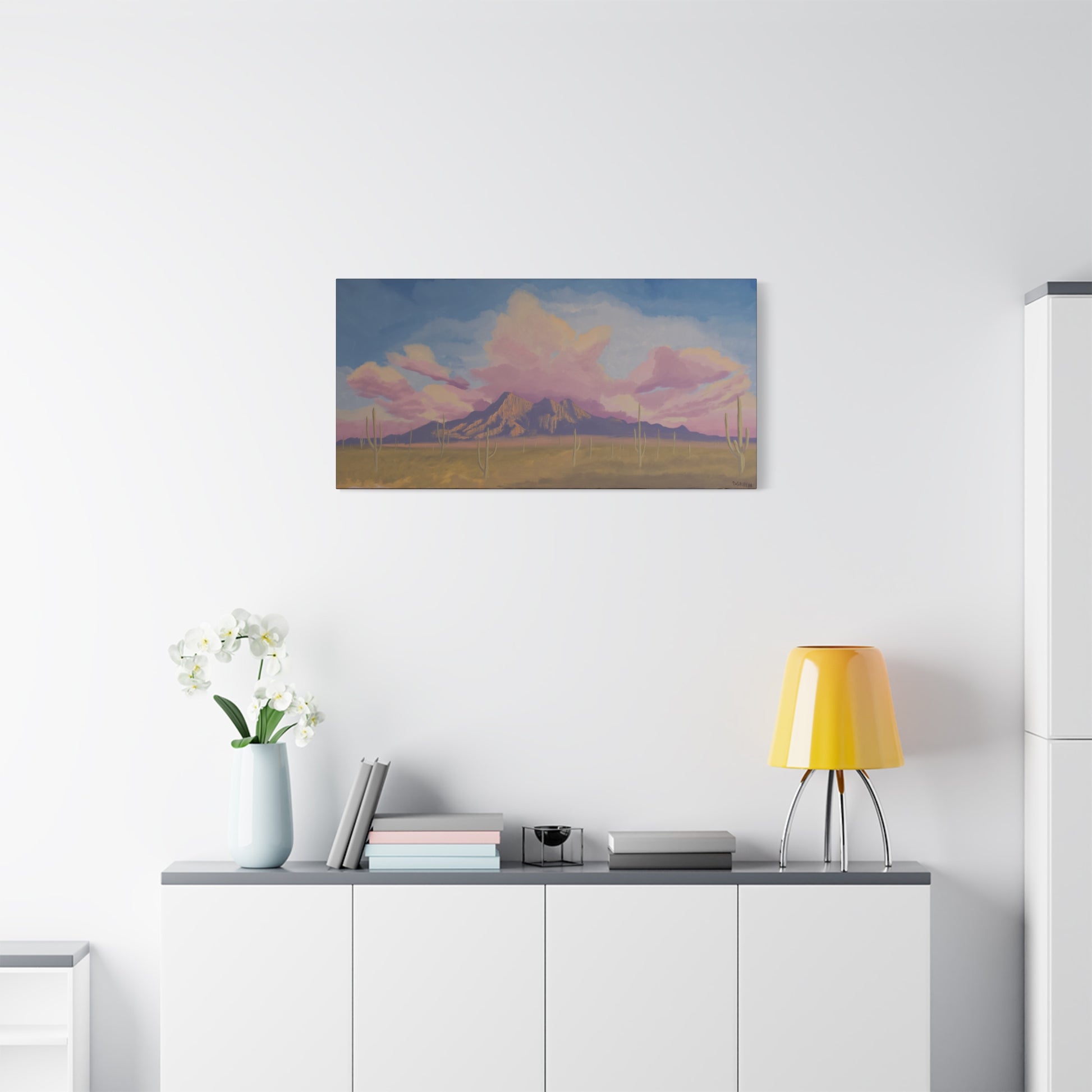 "This painting originates from a view that has become familiar to me on my trips between Tucson and Phoenix. I was drawn to the majestic silhouette of the mountains against the vast desert landscape, particularly as the setting sun paints the sky with a breathtaking array of colors reflected in the clouds. The iconic saguaro cacti stand as silent witnesses in the foreground. This piece is my personal interpretation of that serene and beautiful moment, a scene I've wanted to capture for some time." - Daniel Griffin