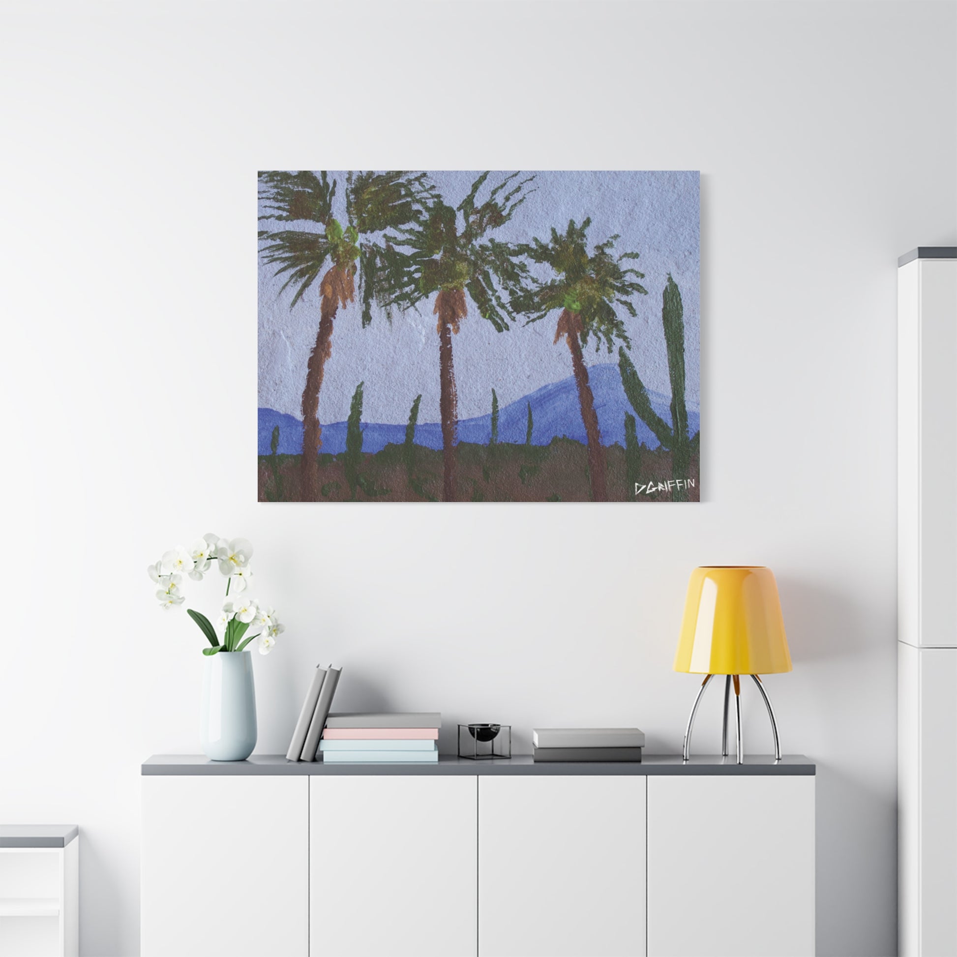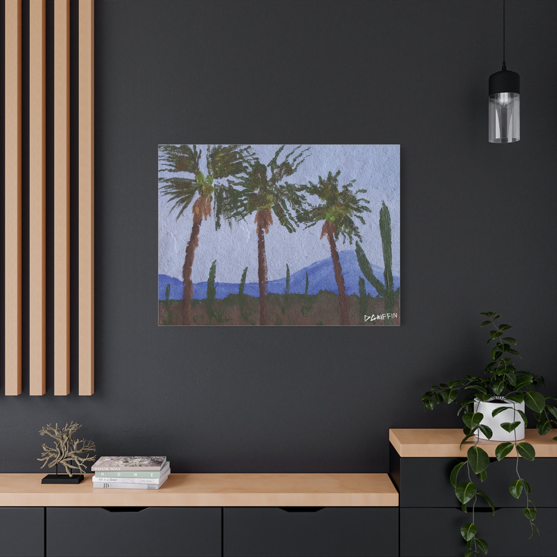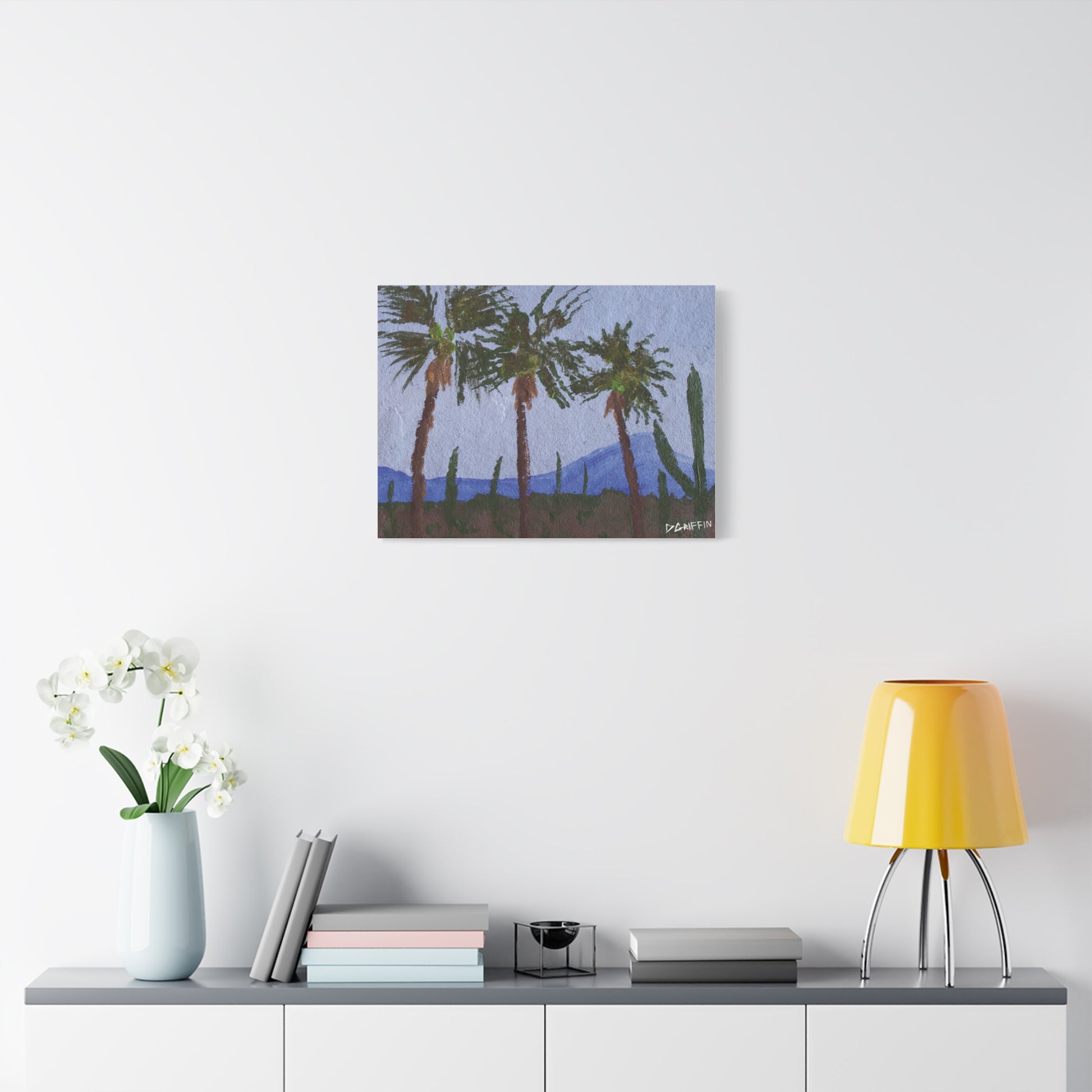 "This piece captures a simplified, bright desert scene featuring three palm trees and some saguaros standing against a pale blue sky and dark blue mountain silhouettes. The composition emphasizes the contrast between the tall, thin forms of the trees and the heavy, brown desert terrain in the foreground. The work was painted using acrylic paint on stone, which lends a textured quality to the piece." - Daniel Griffin