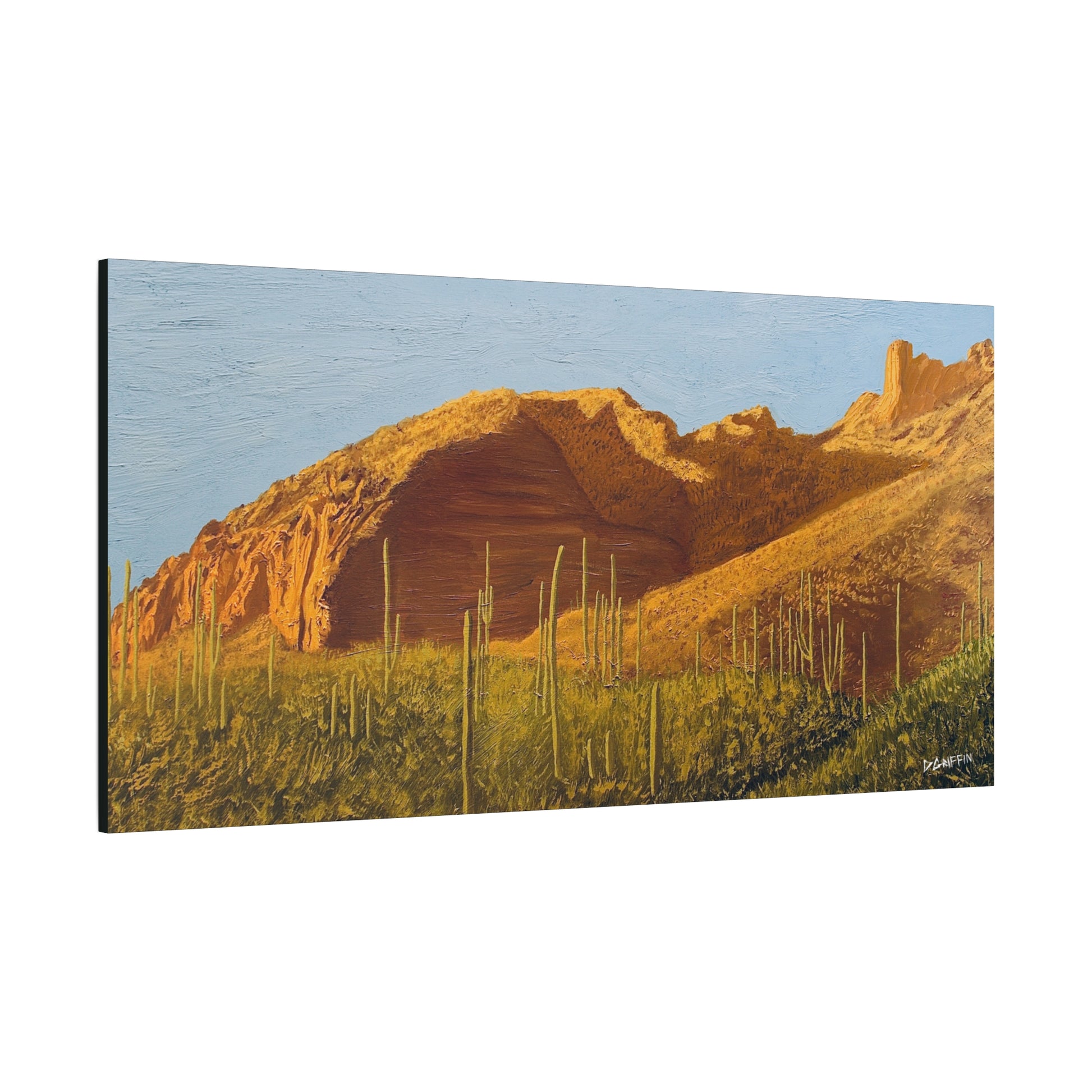 "This oil painting captures the rugged terrain of the Finger Rock trailhead area in Tucson, Arizona. Specifically focusing on the moment of golden hour when the sunlight casts strong shadows on the hills and mountains. My goal was to define the textured mountainside and the field of young saguaros across the foreground." - Daniel Griffin