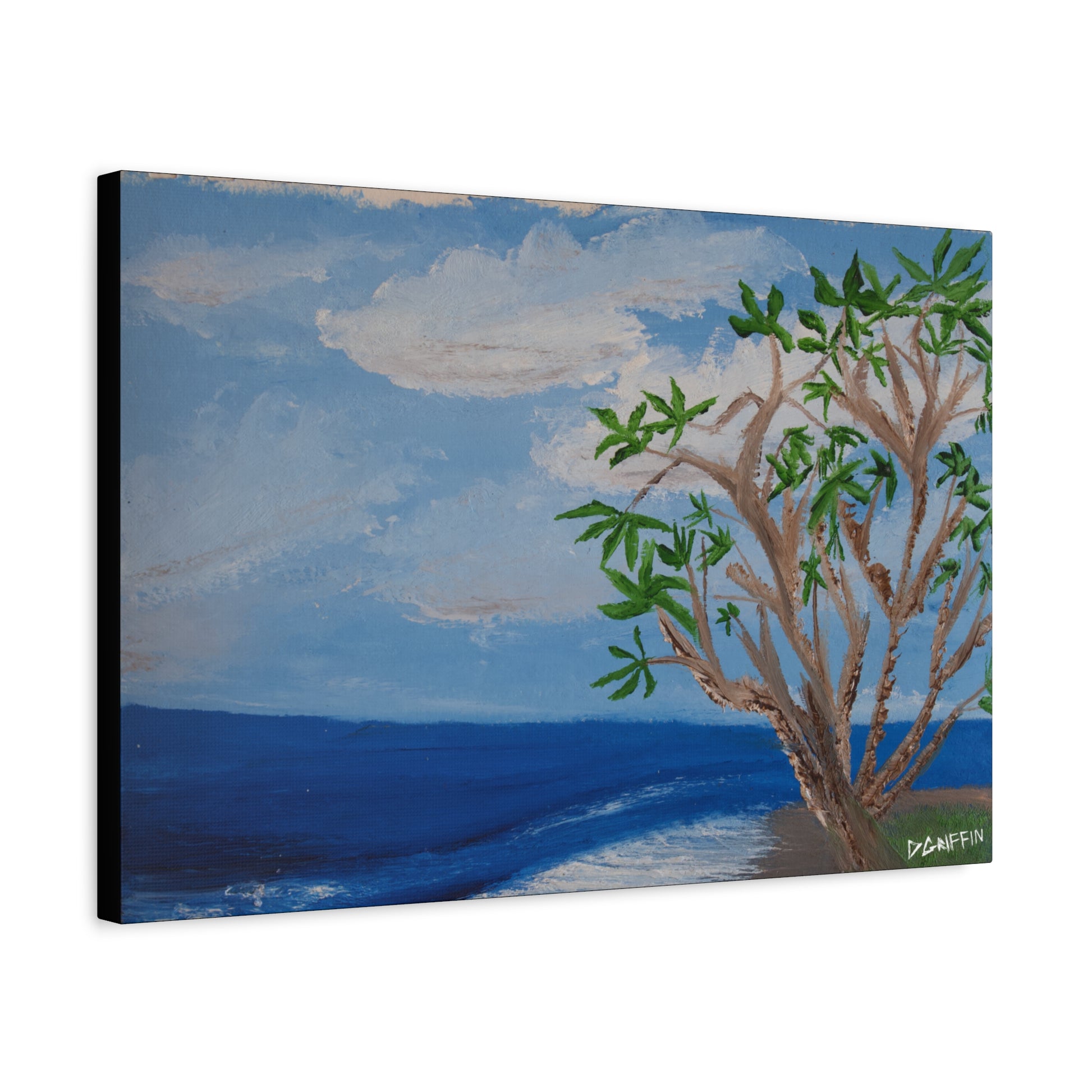 "This painting is inspired by a view I captured while visiting The Big Island. I was immediately drawn to the strong composition of the coastal tree against the vast expanse of the ocean and sky." -Daniel Griffin