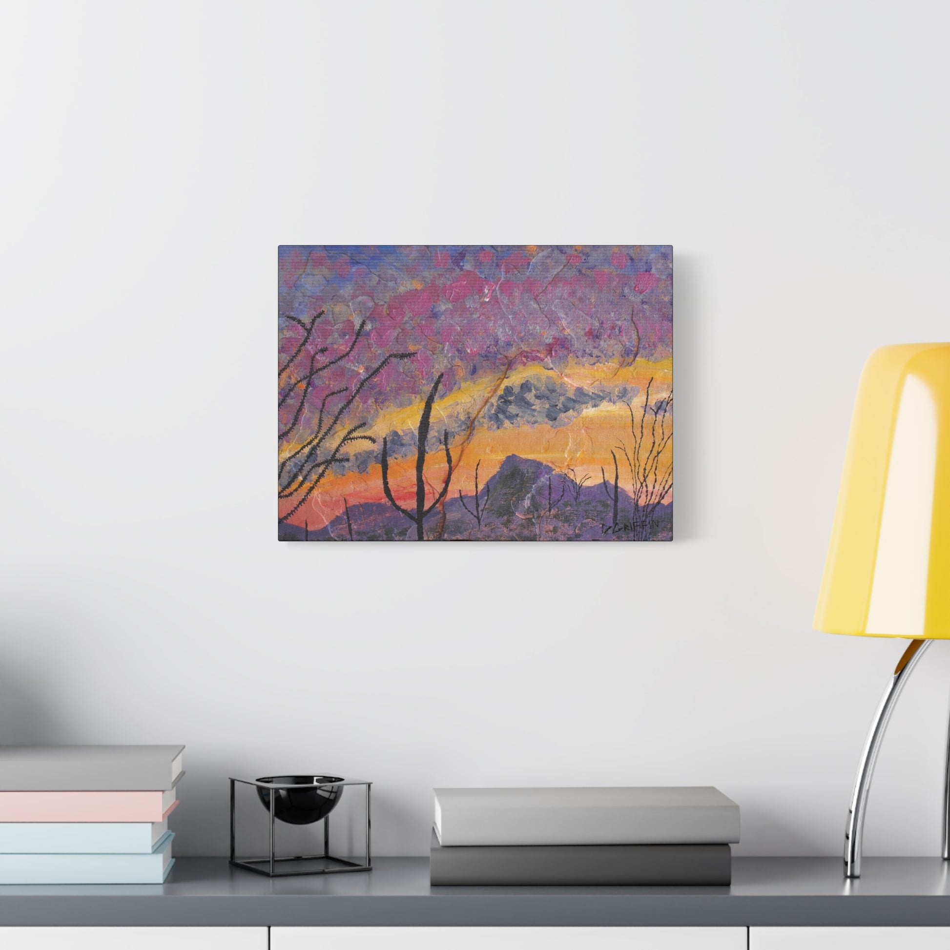 "This piece captures a beautiful, intensely colored sunset or twilight scene after a monsoon, featuring a highly textured sky of pink, purple, and orange. The composition is defined by the dark silhouettes of ocotillo branches and saguaros against the distant mountains. The work was painted on stone, allowing the material to emphasize the highly textured atmosphere." - Daniel Griffin