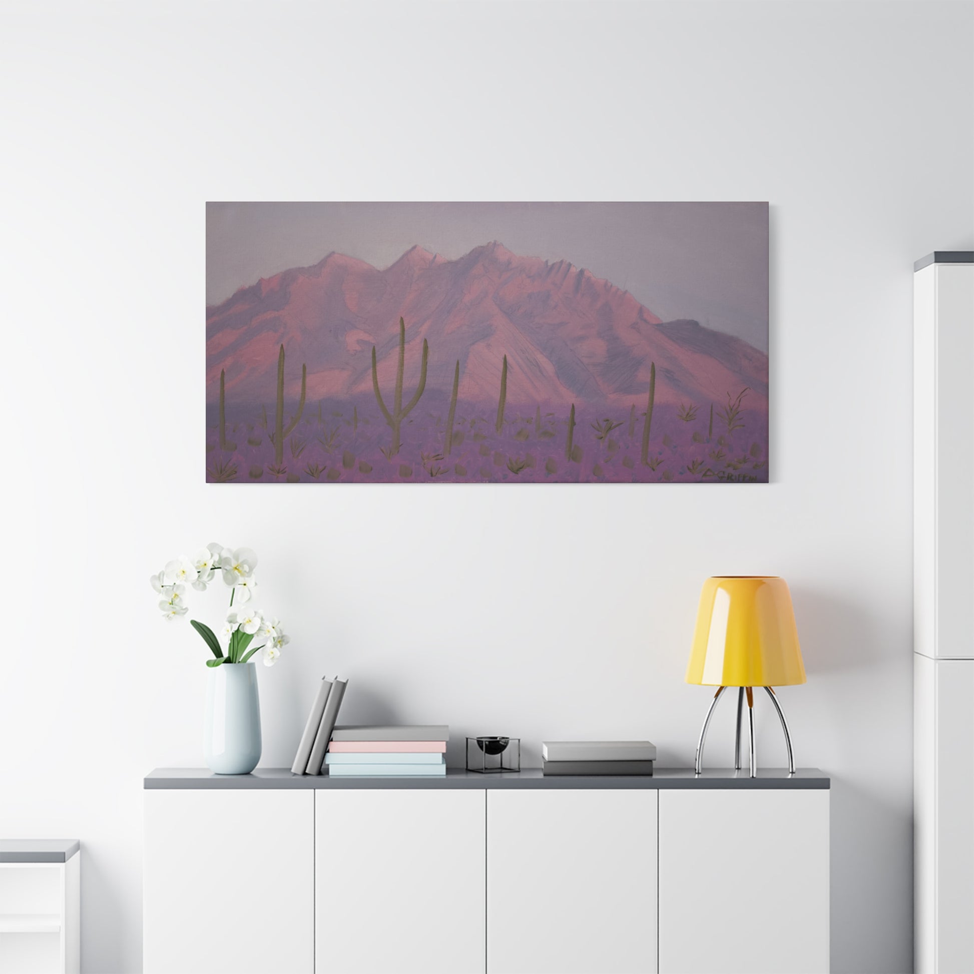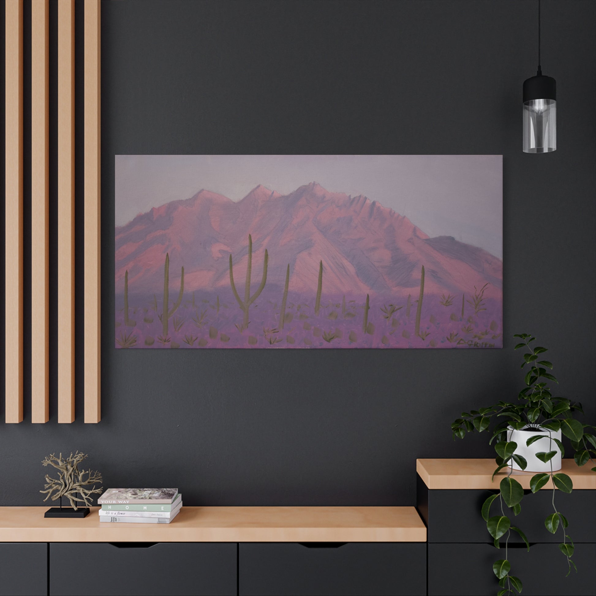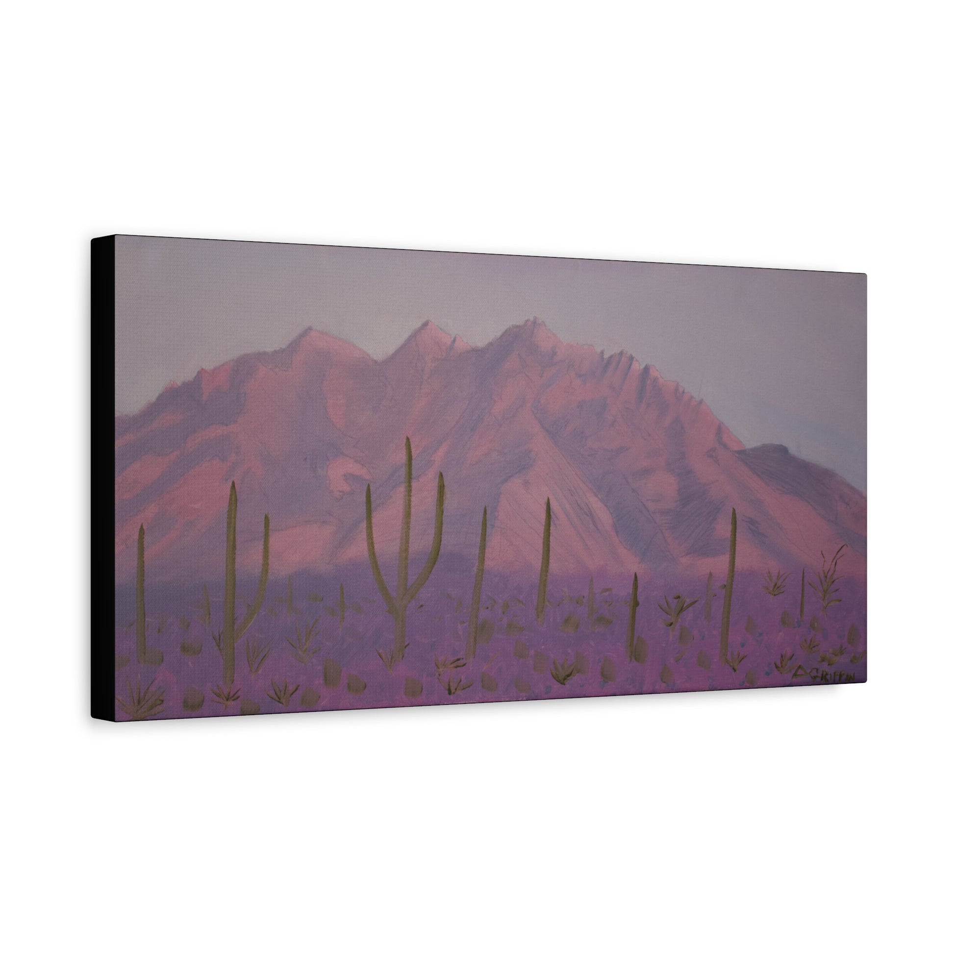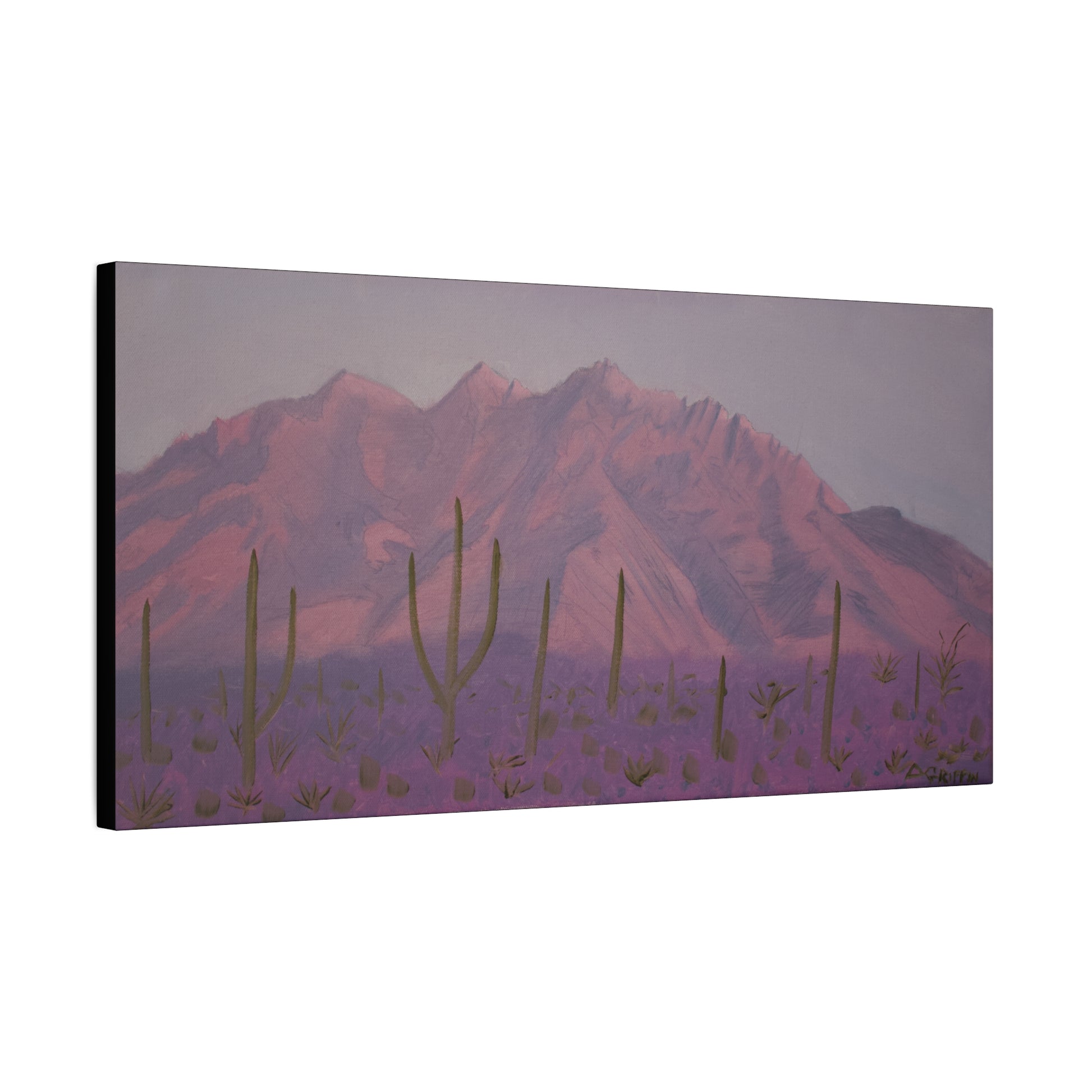 "This piece captures a wide desert scene, featuring a stylized mountain range under a purple wash and prominent saguaro cacti in the foreground. It was created using oil paint, lending a rich, tactile quality to the moody atmosphere." - Daniel Griffin