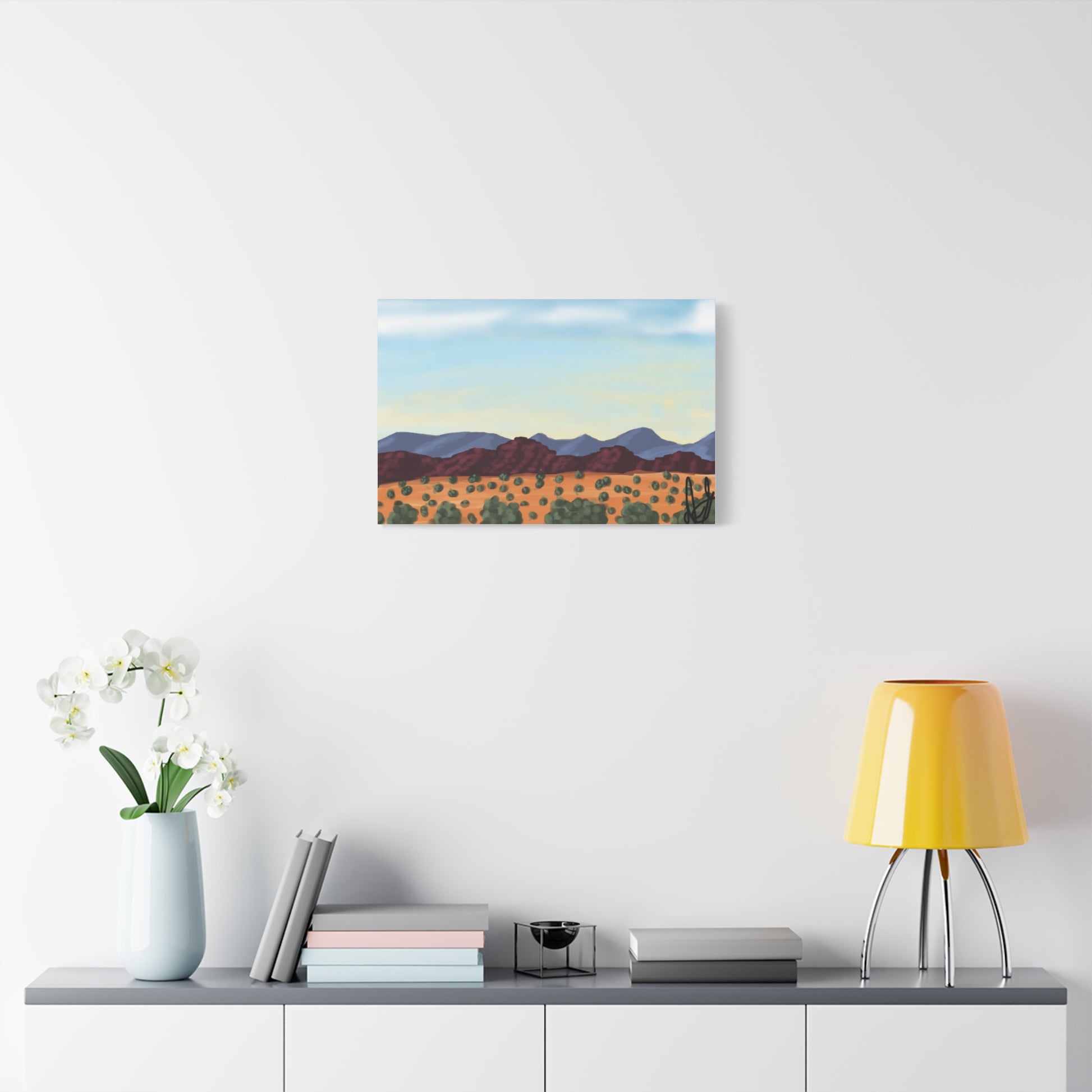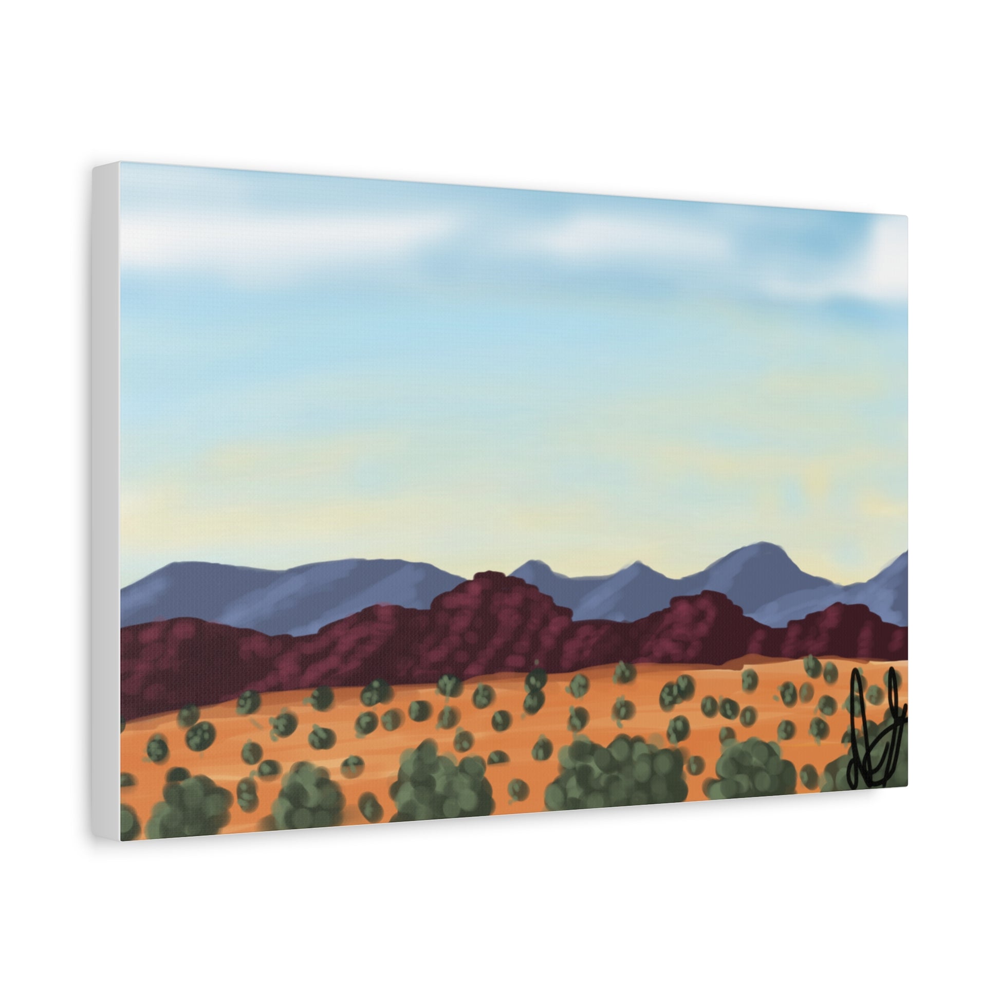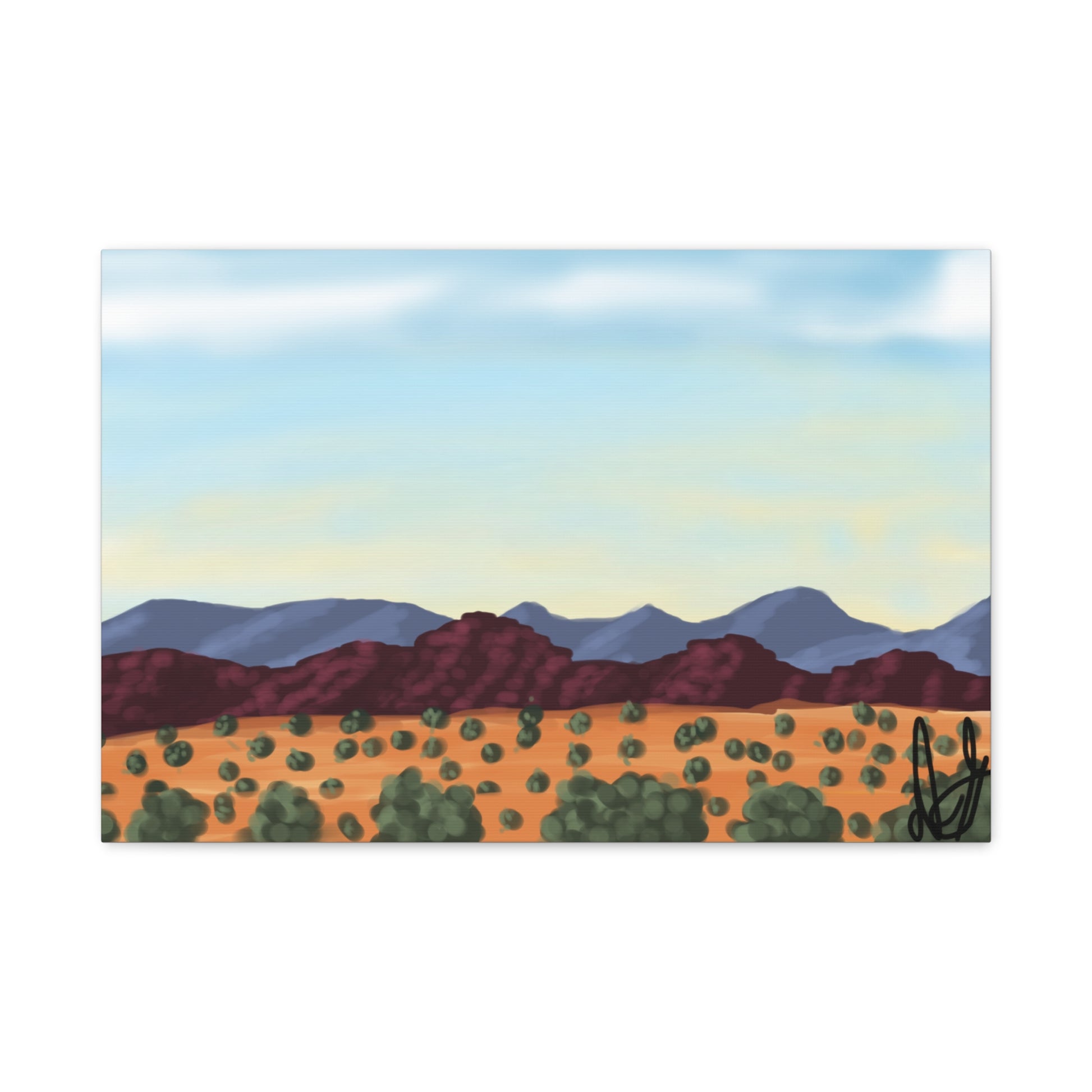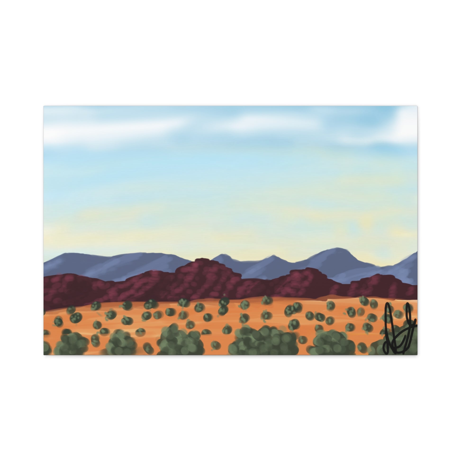"This digital piece captures a desert landscape, featuring layered mountains under a wide, open sky and a foreground filled with scattered desert plants. My goal here was to define the varied textures of the terrain and the distinct color shifts from the reddish foreground to the blue mountains." - Daniel Griffin