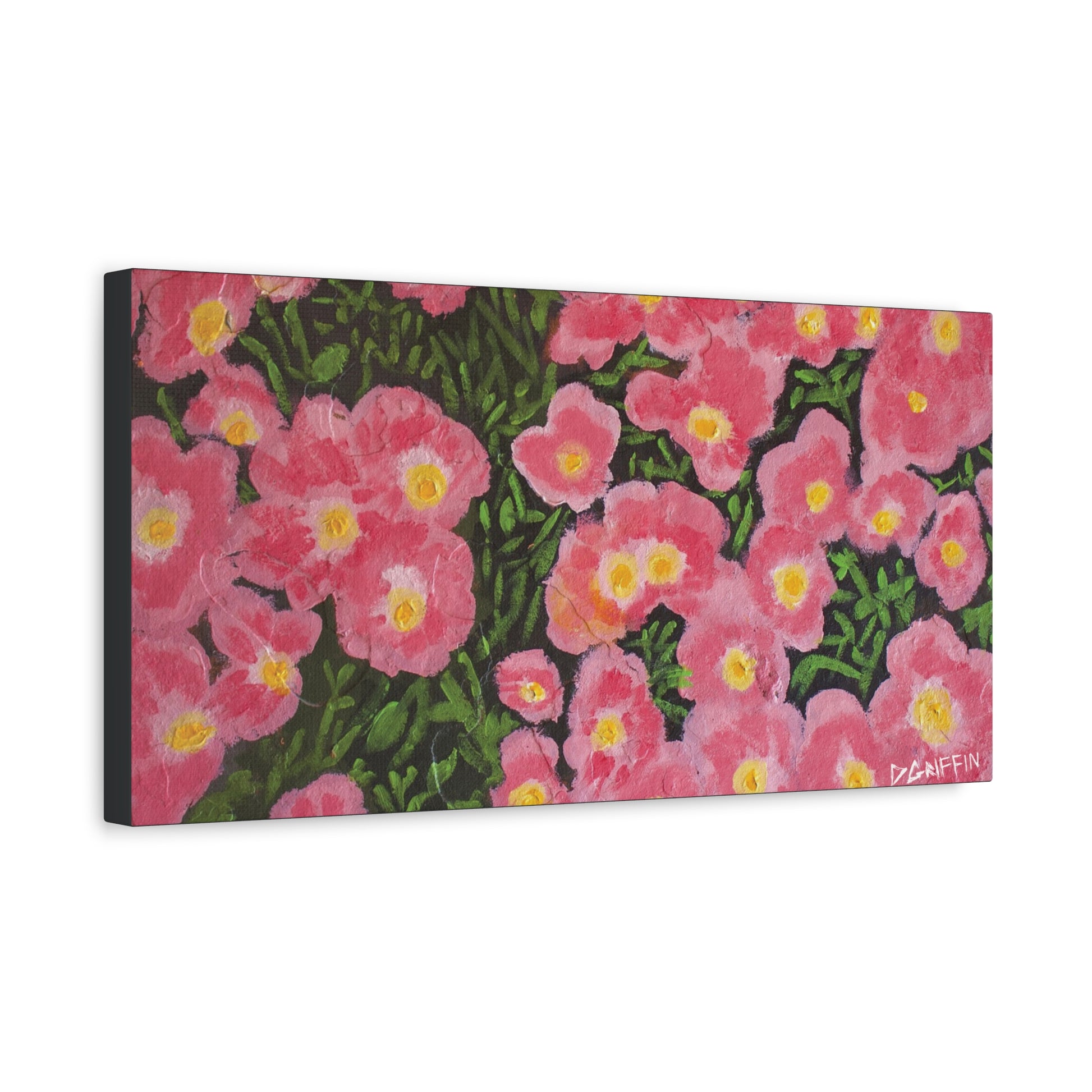 "This piece captures a detailed, close-up view of numerous pink flowers with bright yellow centers, set against a dark, richly textured green background. The composition fills the frame, emphasizing the bold colors and the heavy paint application. The work was painted on stone, which enhances the organic, heavy texture of the floral composition." - Daniel Griffin