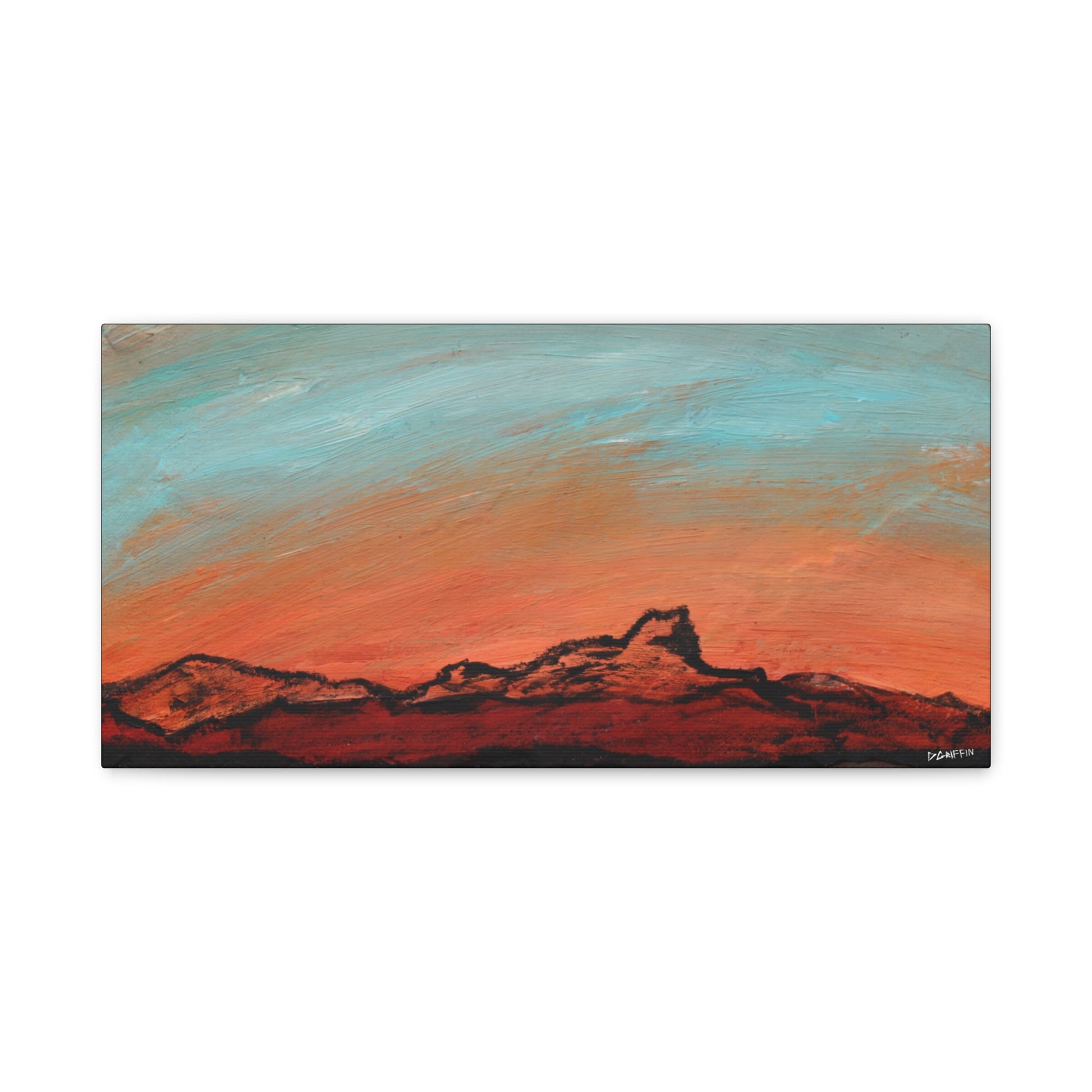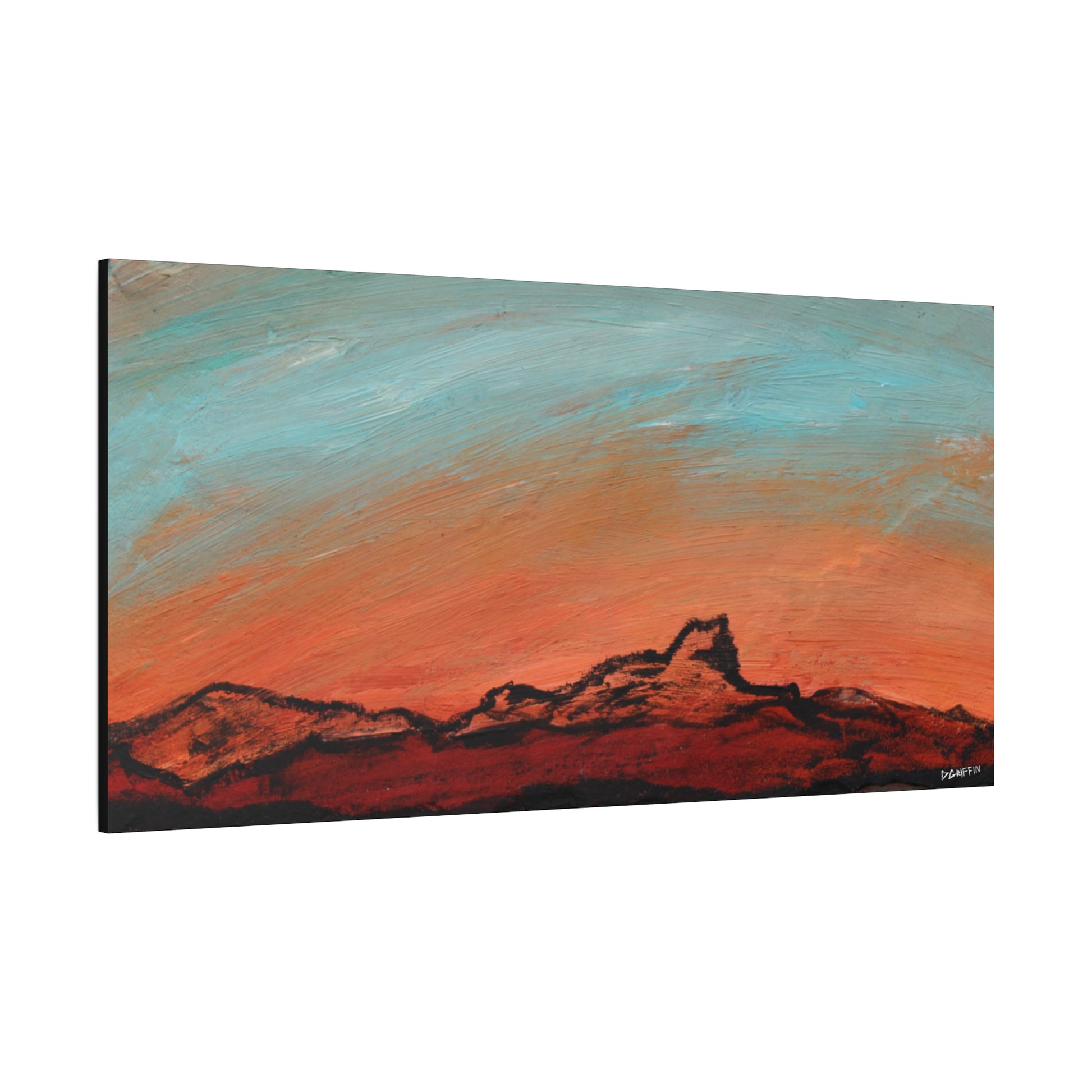 "This piece captures the intense color contrast of a desert sunset, featuring a wide sweep of orange and turquoise above a dark, stylized mountain silhouette. The work was painted on stone, emphasizing the stark, horizontal line of the arid terrain against the sky." - Daniel Griffin