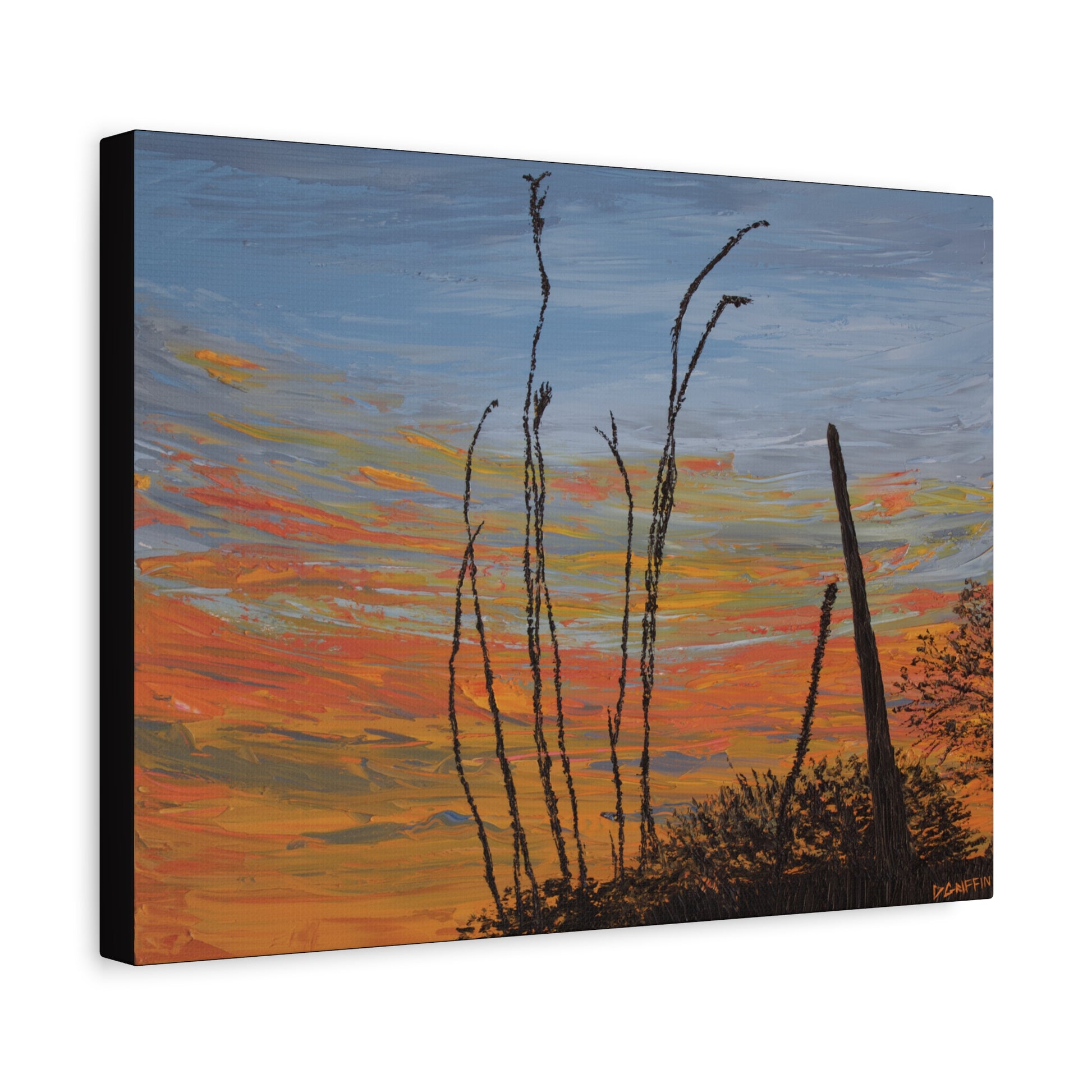 "This painting is a study of light and form in the desert at dusk, inspired by the silhouettes of the ocotillo and saguaro against a fiery sunset. The entire piece was created exclusively with a palette knife, an intentional process that allowed me to build the vivid texture you see in the sky and the foreground. It's a way to convey the feeling and energy of that beautiful twilight moment." - Daniel Griffin