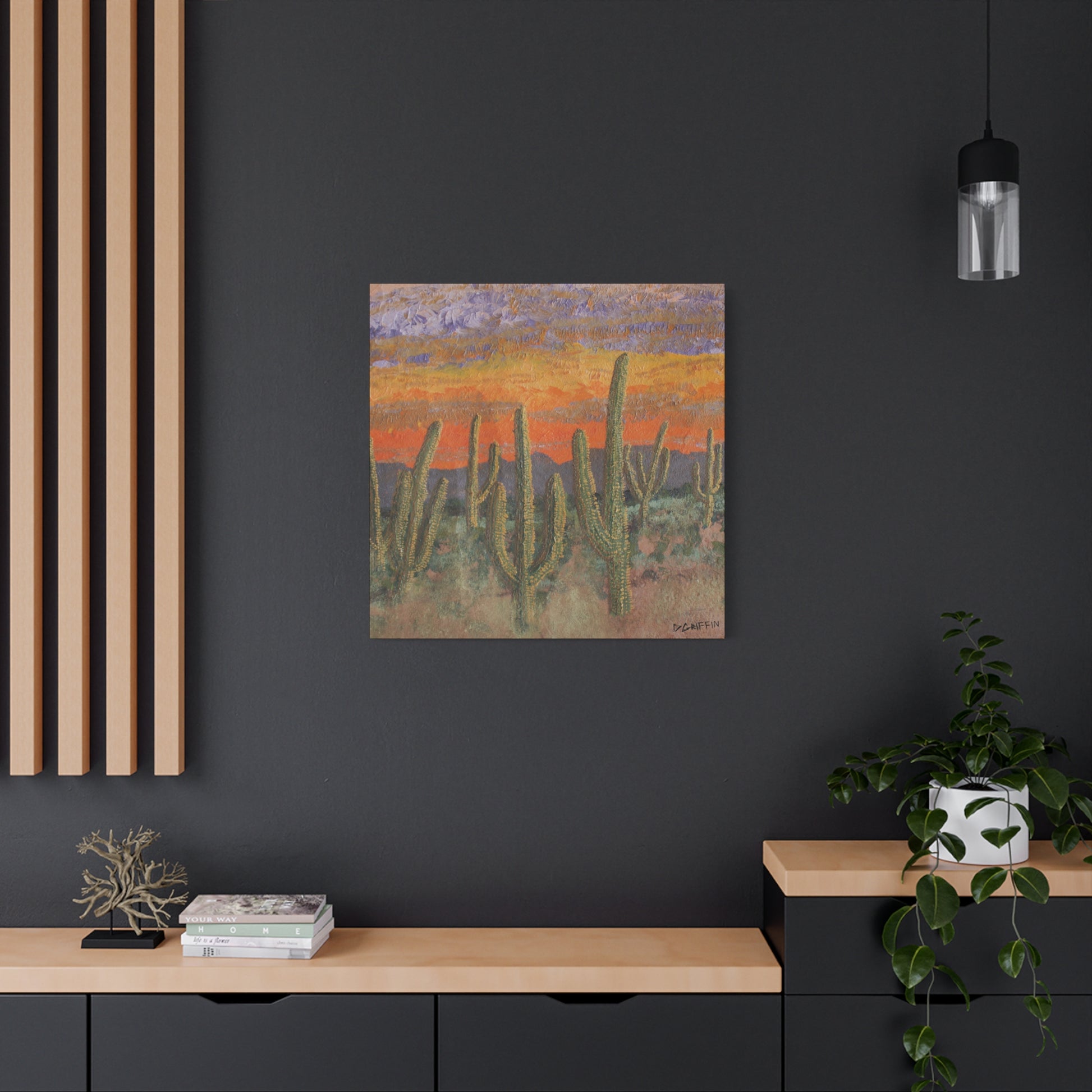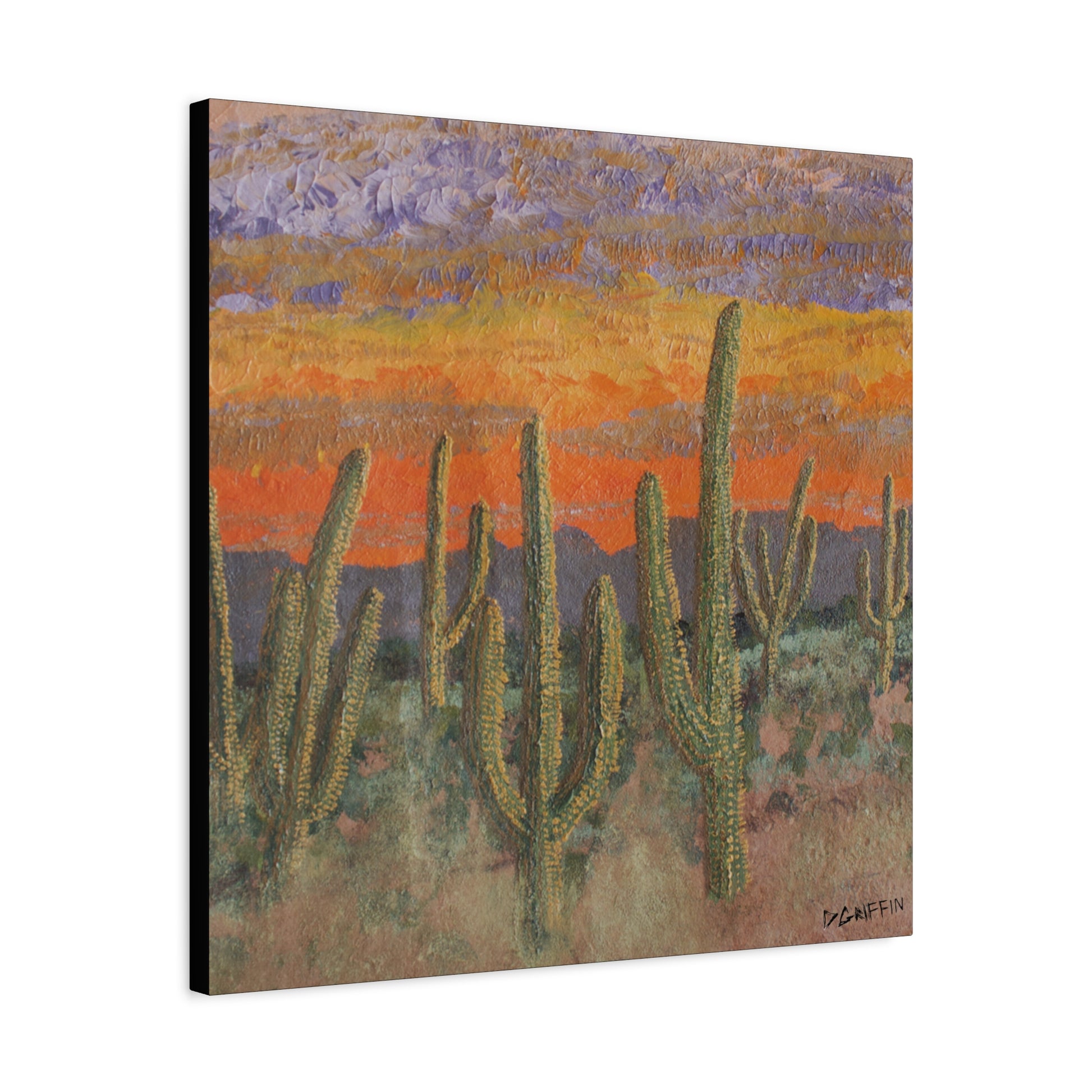 "I was motivated to capture the saturated colors of a desert sunset in Marana, Arizona, with the saguaros standing tall against a wash of orange, yellow, and violet. This work was originally painted on a piece of stone, translating the vibrant energy and texture of the landscape." – Daniel Griffin