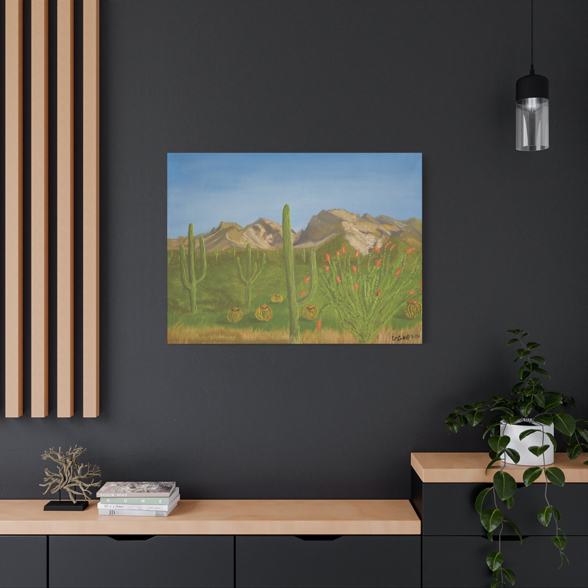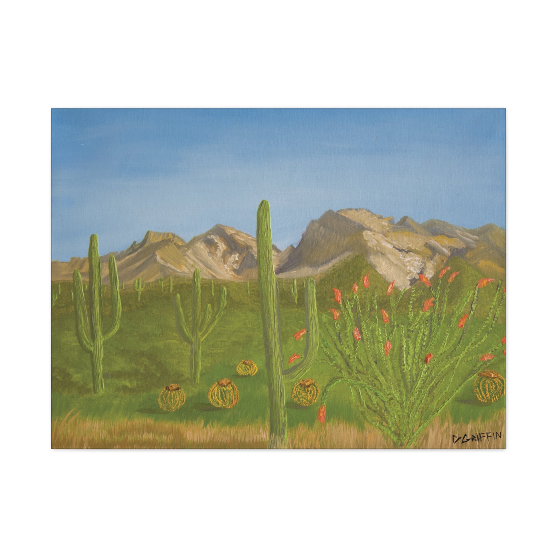 "This painting is a record of my very first attempt to interpret the iconic Catalina Mountains from the unique perspective of Oro Valley. I was motivated to capture the sense of life and saturation of the desert after a rainy period, focusing on the vibrant greens of the ocotillo, saguaros, and surrounding plant life. This work represents a personal step in my process—translating the majesty of a familiar mountain range for the first time, while celebrating the diverse flora of the Arizona landscape." -Daniel Griffin