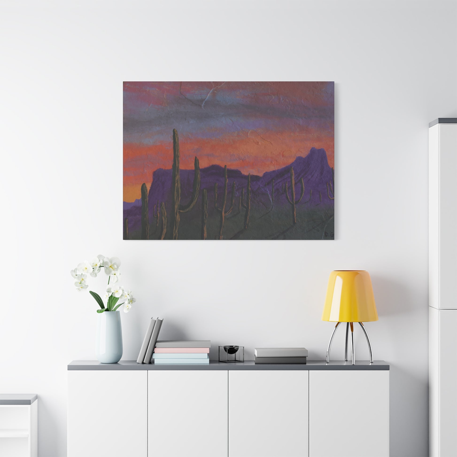 "This piece captures a vibrant sunset over the Twin Peaks area in Marana, Arizona, featuring the mountains and the desert floor under a sky of intense colors. My goal here was to define the strong silhouettes of the saguaros and mountains against the colorful backdrop. This work was originally painted on a piece of stone." - Daniel Griffin